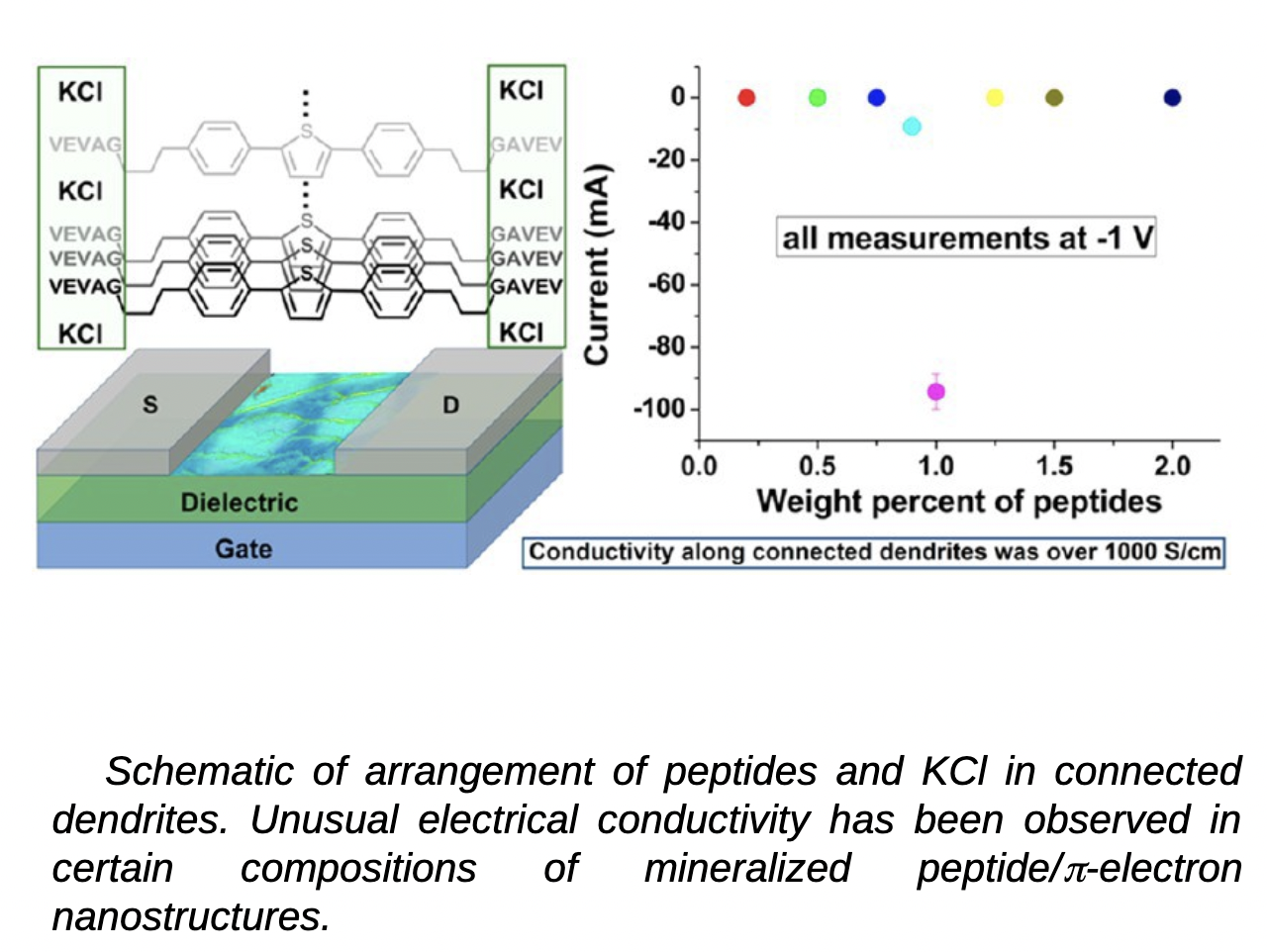 Dendritic structures assembled via connections between mineralizing KCl crystallites initiated by pH-triggered self-assembly of peptide materials was demonstrated. Connected structures were found to be the most important factor for producing highly conductive nanowire assemblies that showed conductivity comparable to that of a metal (~1800 S/cm). Measurements of conductivity over time and conductivity quenching by ammonia suggested the conductivity of these dendritic networks was derived from proton doping of the central π-electron units in strong acid environment and was facilitated by closely spaced chromophores leading to facile π-electron transfer along the interconnected dendritic pathways. It is expected that more electrically relevant materials may be able to be templated through this approach.